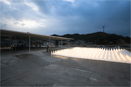 Nando, Naoshima Standard 2, 2006, Photos Takumi Ota''Based on these criteria, we decided to use white traffic cones for all of the signs. We also wanted to send a subtle message with them, so we added a hand touch to each and every one of them. When we put lights in some of the cones, irregularities in the metal molds used to make gave them a soft glow like light shining through Japanese handmade paper. We placed 625 of these cones at the ferry dock in Miyaura, the main entrance to the island. Once an hour, the cones are triggered by the waves, and programmed to light up to welcome visitors.''